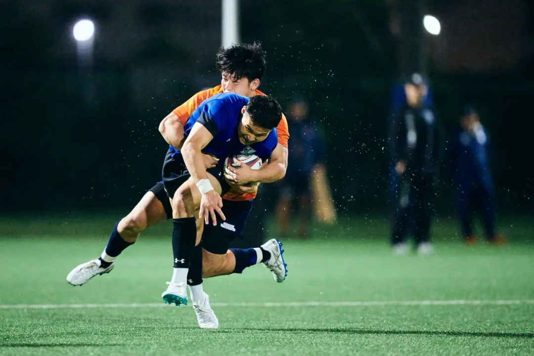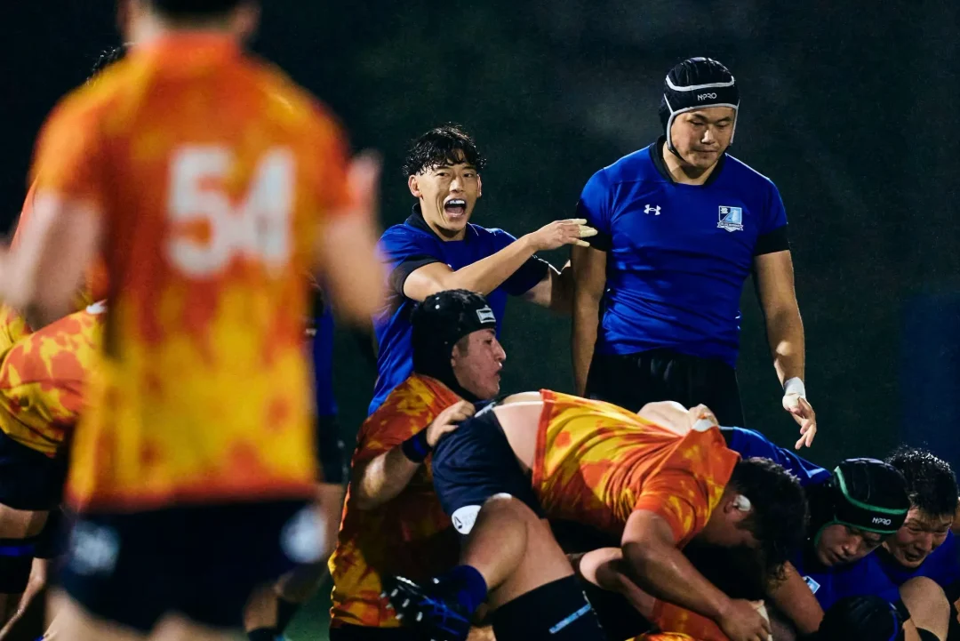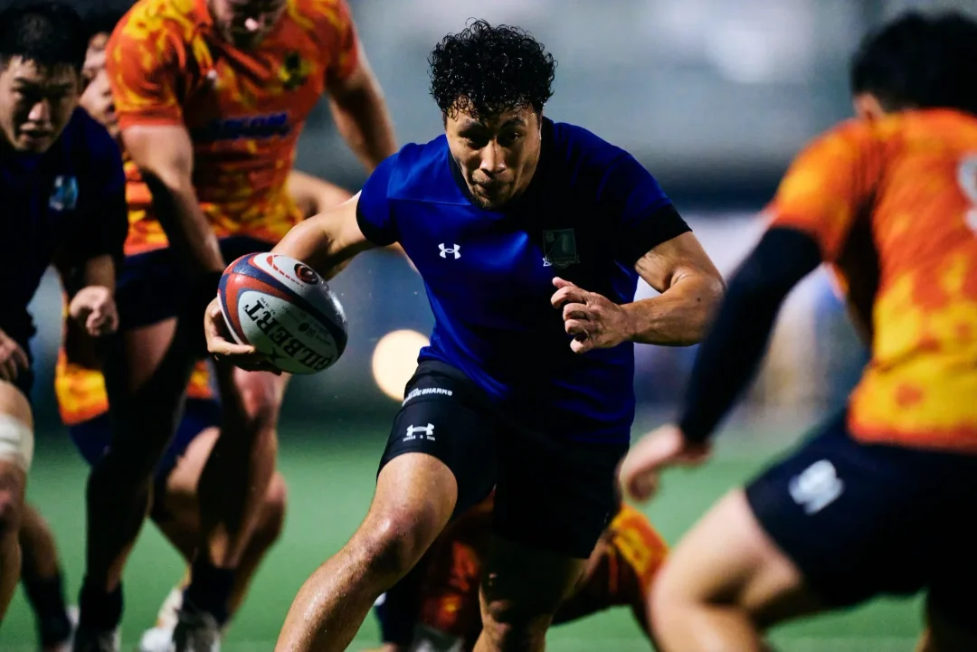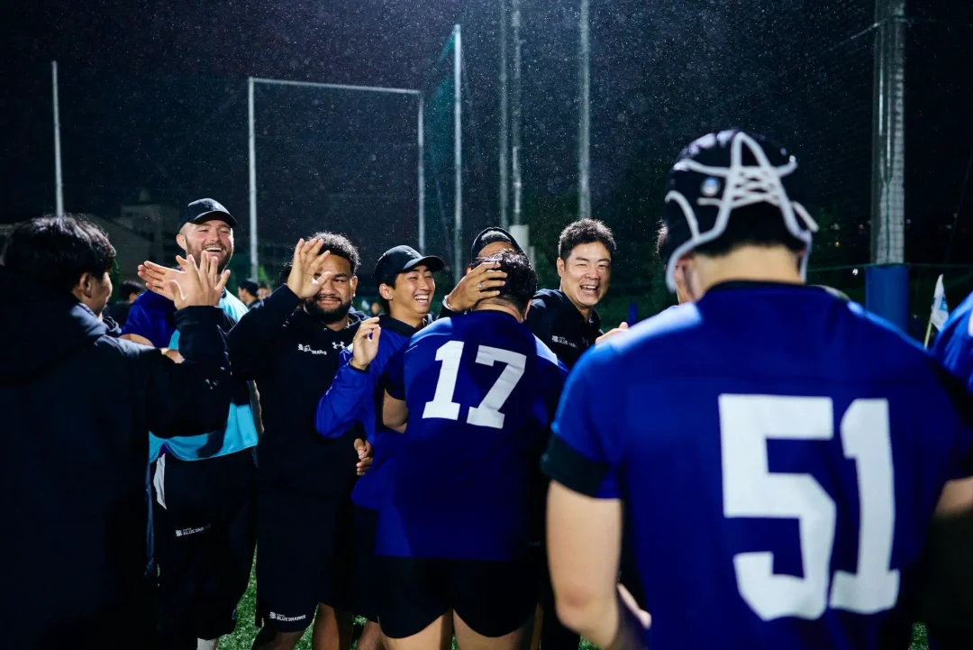 夜間照明に照らされた小雨が、試合後の歓喜に沸くブルーシャークスの選手たちに優しく降り注いでいた。これまで彼らの積み重ねてきた時間を見届けてきた荏田グラウンドの光が、この夜も変わらず彼らを照らしていた。「じゃあ、菅原いこうか!」吉廣ヘッドコーチの声が円陣の中に響いた。常に自らを磨き続けるプロップは、試合終了残り10分から出場し、最後のトライを生んだスクラムを最前線で支えた。チームメートから「影のプレーヤー・オブ・ザ・マッチ」に推され、照れくさそうに一歩前へ。「指名された選手の一言」を促されるも、おどけるように辞退する。その瞬間、輪の中から笑いと拍手が湧き起こった。小雨を弾くような明るい声が夜気に溶けていく。それは、互いの努力と成長を喜び合う、ブルーシャークスというチームの文化そのものだった。
